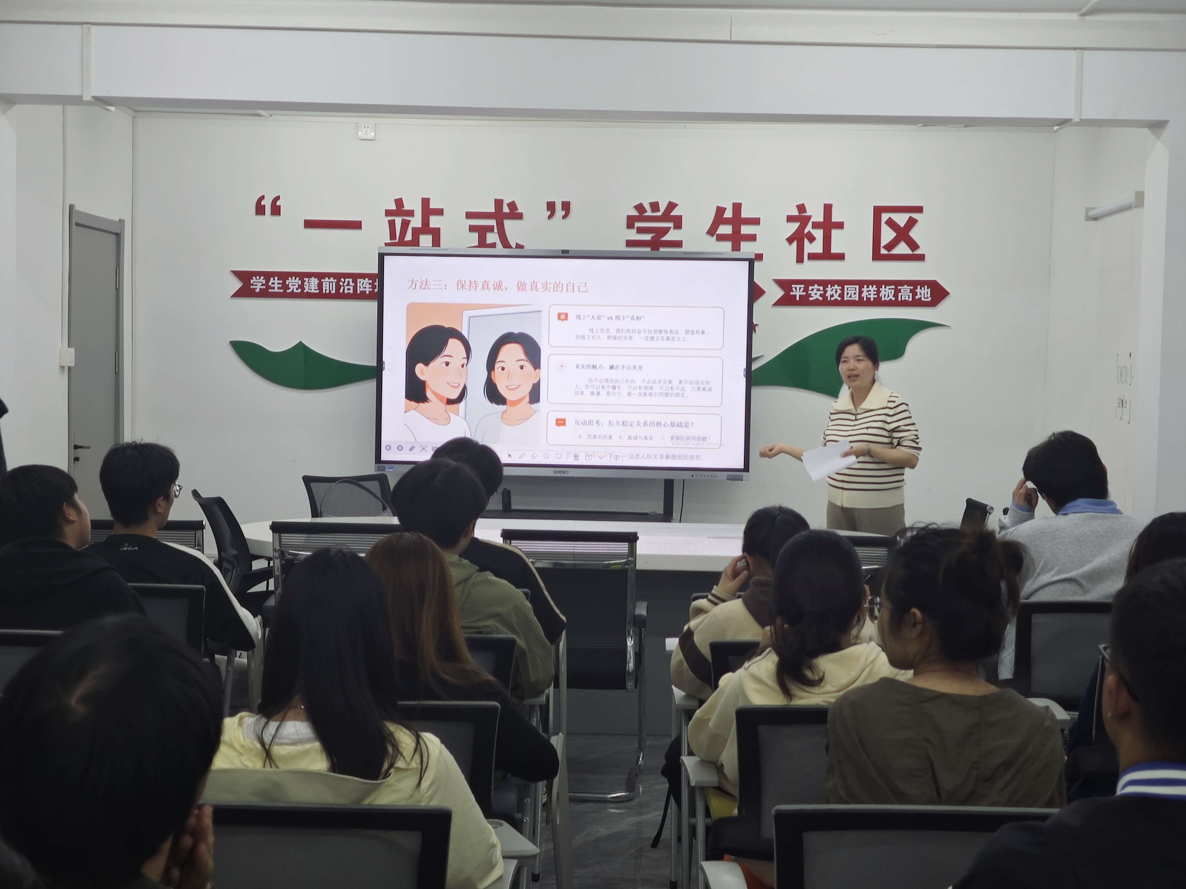 4月14日下午,数学科学学院在红角洲校区“红五星”一站式学生社区综合服务中心,举办“从线上好友到身边知己:重建真实人际连接”心理健康讲座,由辅导员章雯主讲,引导学生建立真诚、健康的人际关系。讲座紧密结合当代大学生生活实际,深入剖析“群体性孤独”等典型社交现象,即表面线上热络、实则内心疏离的矛盾状态。围绕“主动表达善意、专注倾听理解、坚守真诚本心、加强线下互动”四个维度,章雯讲解了“用一句真诚的赞美打破僵局,...