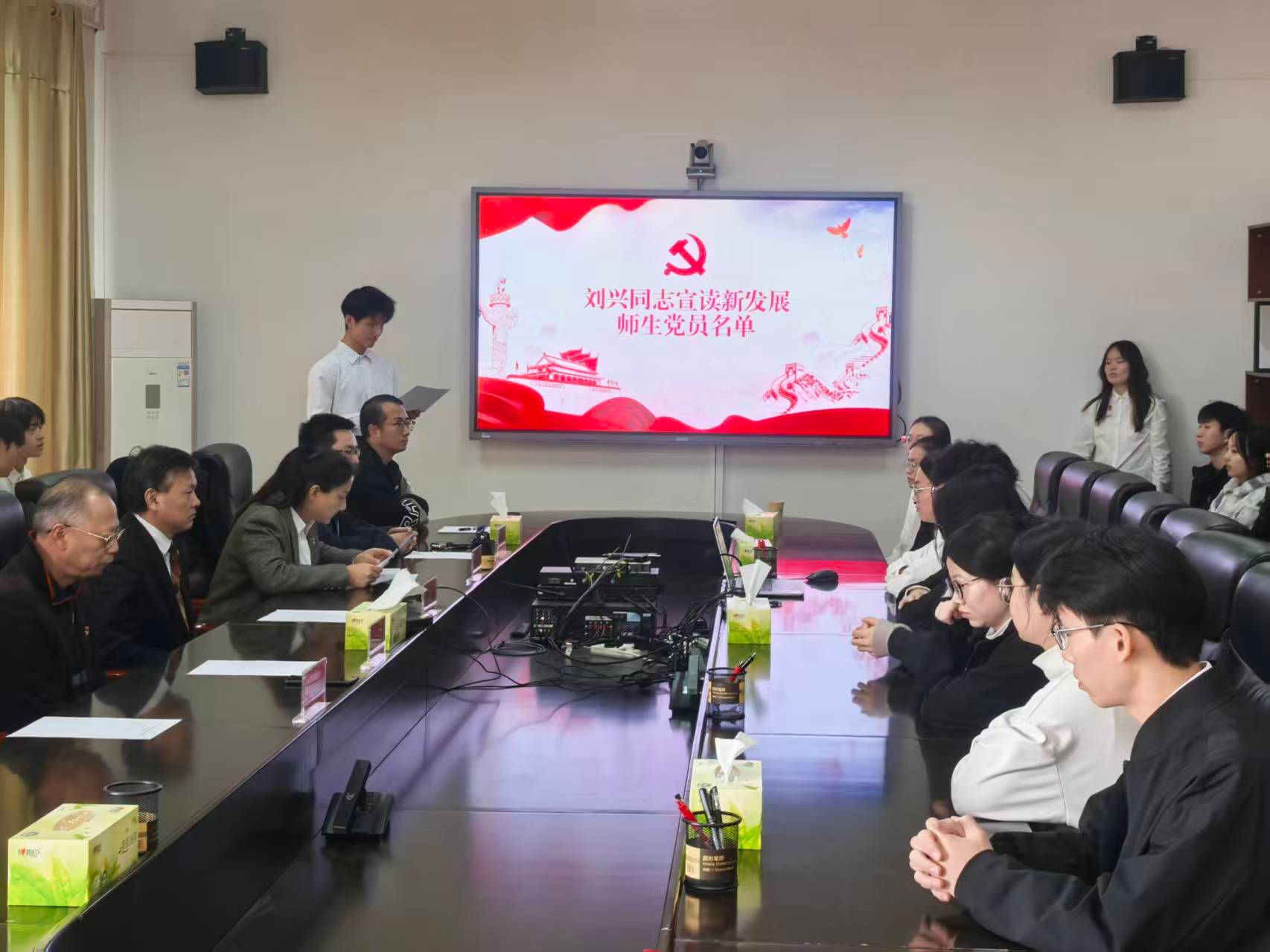 仪式在高唱《中华人民共和国国歌》中正式开始,激荡起每个人的爱国情怀。随后,刘兴宣读了新发展党员名单并介绍其成长历程和入党初心。教师党员代表为新党员颁发党章、佩戴党员徽章,并赠送政治生日贺卡。在鲜红的党旗下,在场的全体党员高举右拳,庄严宣誓,铿锵誓言表达了为党的事业奋斗终身的坚定决心。