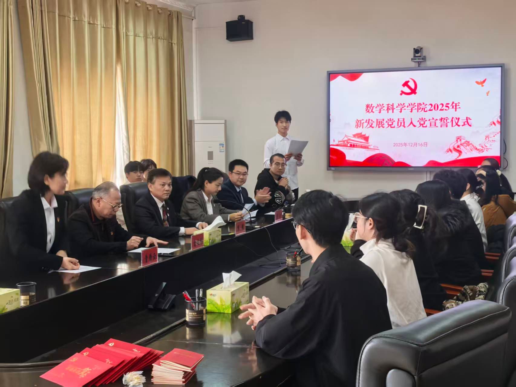 誓言铿锵,信念如炬。12月16日,数学科学学院在行政楼C459会议室为30名2025年新发展师生党员举行了一场庄严而简朴的入党宣誓仪式。学院党委书记熊鹰、教工党支部书记雷敏剑、本科生本科生党支部书记朱慧斌、研究生班主任童倩云出席仪式,全体新发展师生党员、入党积极分子代参加仪式。仪式由学院党委副书记刘兴主持。