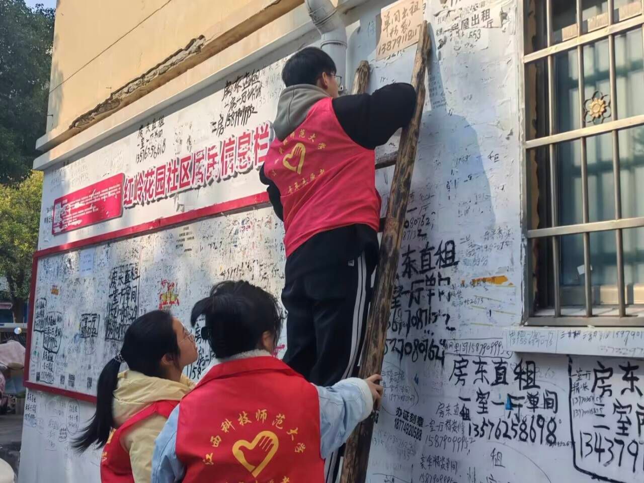 在“擦亮家园”行动中,十余名学生志愿者与社区网格员协力清理楼道墙面、电表箱、宣传栏等处的各类“牛皮癣”广告。大家手持专业工具,通过喷湿、铲除、擦拭等步骤,彻底清除顽固痕迹。志愿者们配合默契,接力处理高处贴纸,并将清理后的垃圾分类回收。行动不仅美化了社区环境,也提升了同学们的协作与实践能力。