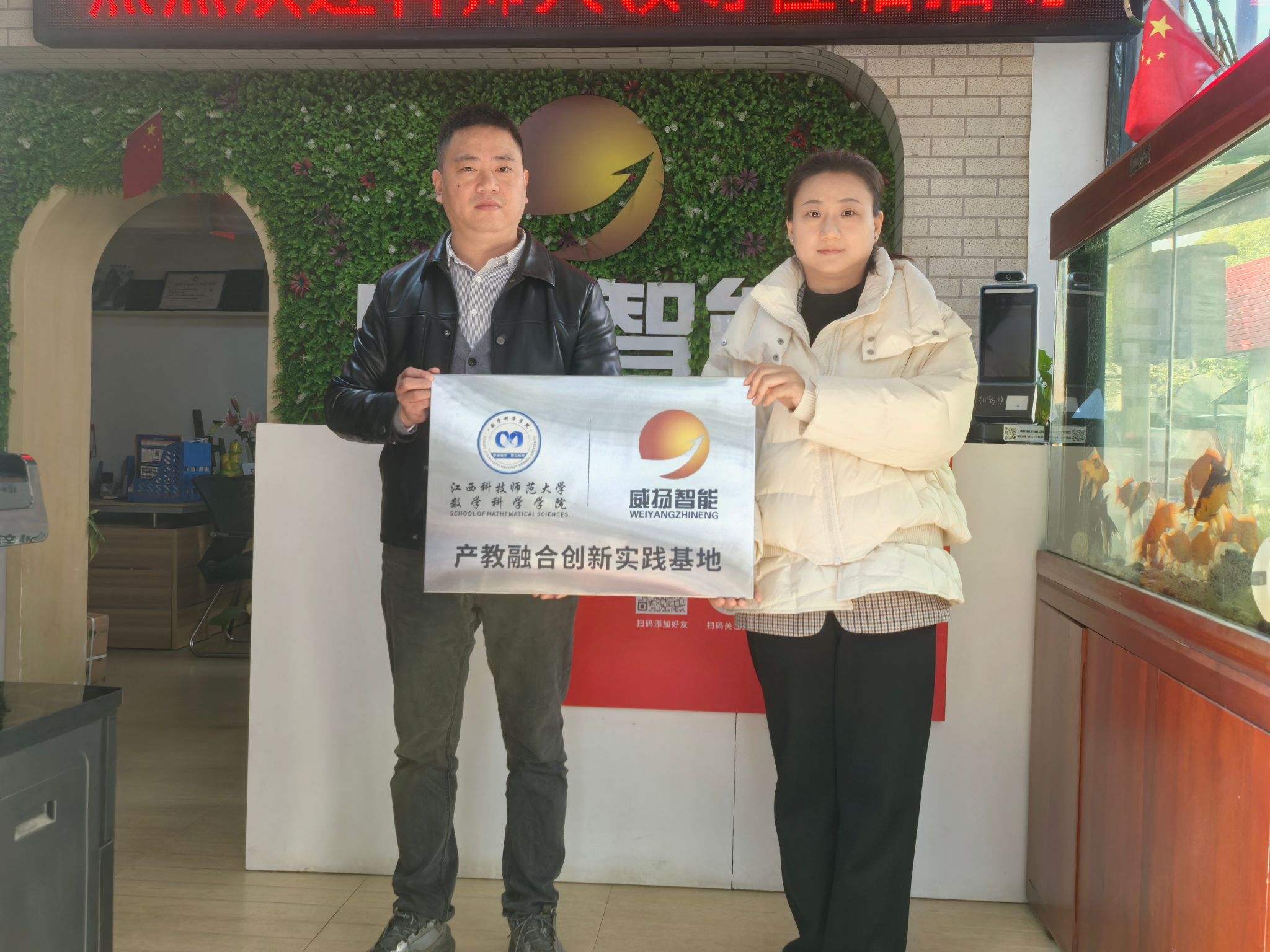 2025年12月25日,数学科学学院与江西威扬实业有限公司(威扬智能)合作共建的“产教融合创新实践基地”正式揭牌。学院党委副书记刘兴一行赴企业参加仪式,与公司总经理吴高阳共同为基地揭牌。