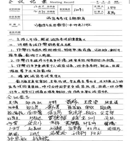 班会期间,各班辅导员带领学生学习学校考试相关规章制度与纪律要求,深入阐释诚信考试的重要意义,并结合实际案例说明违反考纪的严重后果。同学们认真聆听学习,进一步理解诚信应考对个人学业发展与品德修养的重要作用。会后,全体同学在会议记录上郑重签名,表达自觉遵守考试纪律、维护学术诚信的坚定态度。
