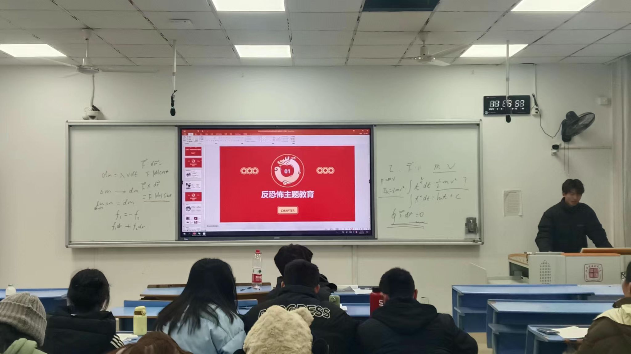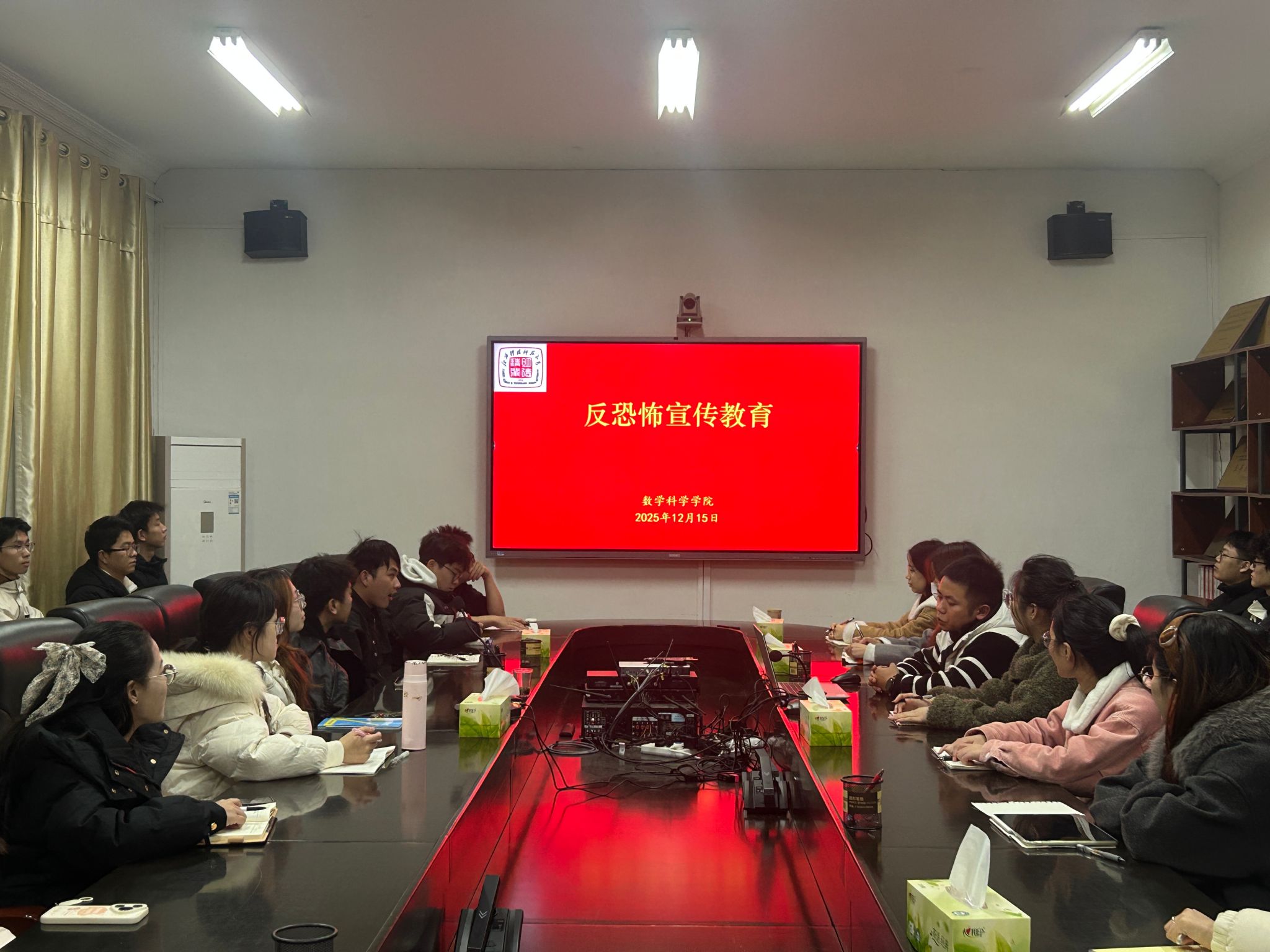 2025年12月15日—18日,数学科学学院于红角洲校区开展“全民反恐 共创平安”系列宣传教育活动,组织全体学生参与反恐主题班会。