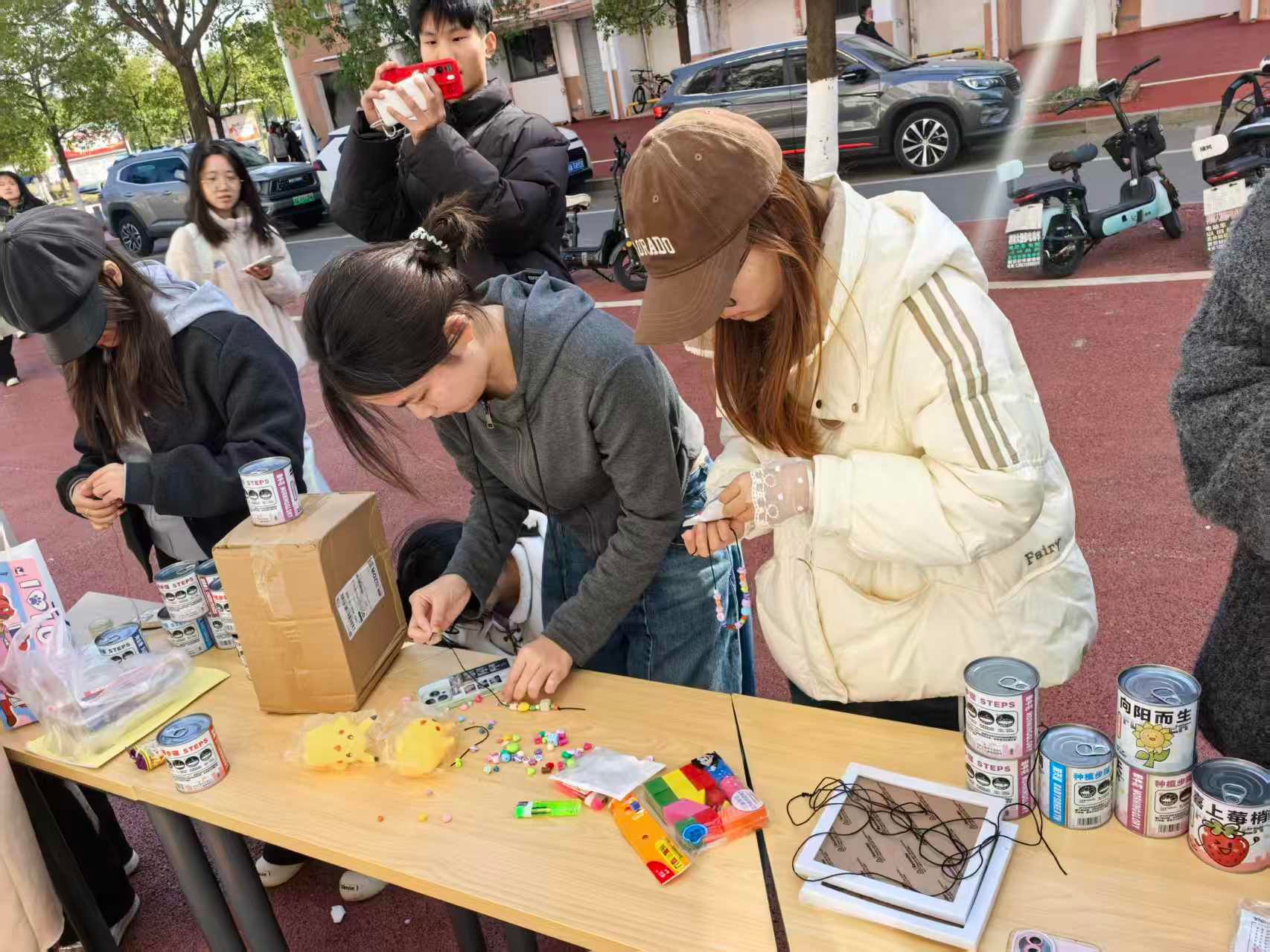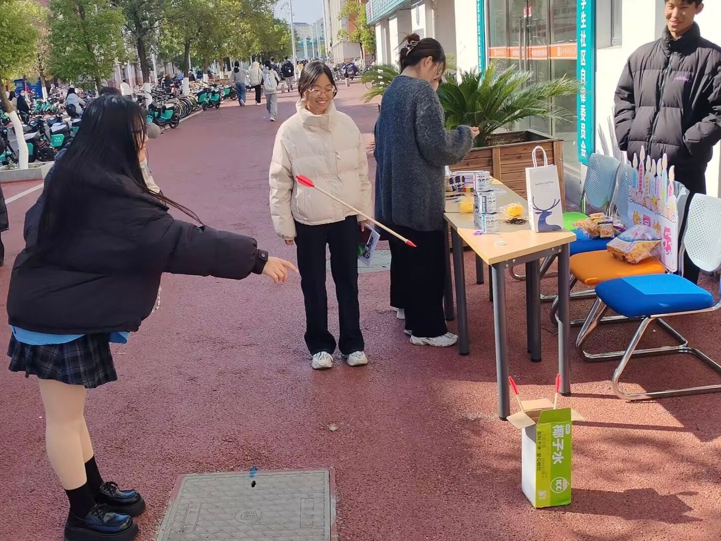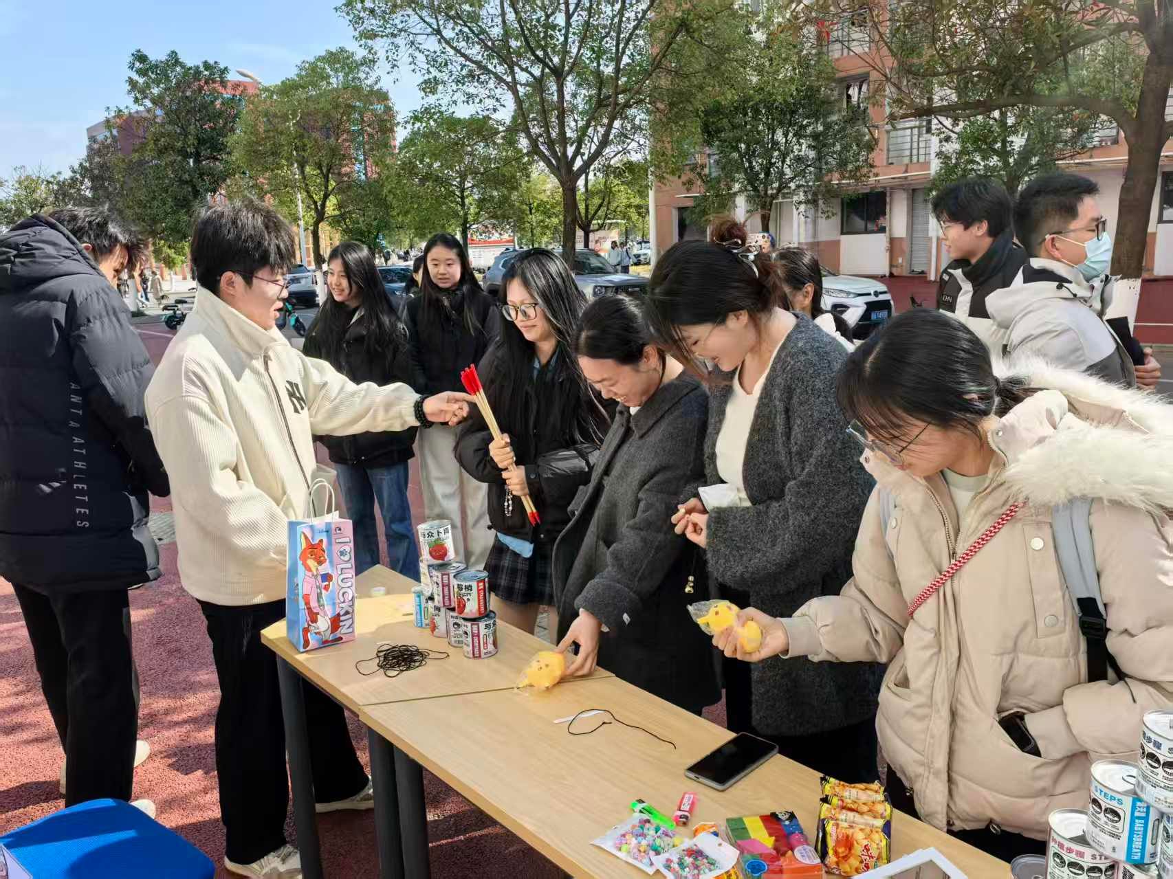 手工创作区吸引了众多同学积极参与。大家运用五彩绳、琉璃珠等材料,专注投入手机链的创意制作。在热烈讨论配色与交流编织技巧的过程中,一件件独一无二的专属信物逐渐完成,既成为对生日的特别纪念,也见证了同窗之间的深厚情谊。投壶区域气氛活跃、欢声不断。同学们凝神瞄准、沉稳投掷,每当箭矢入壶,现场便响起阵阵掌声与喝彩。活动还准备了丰富奖品,大家在传统游戏的现代体验中不仅收获了惊喜,也增强了彼此的沟通与默契。